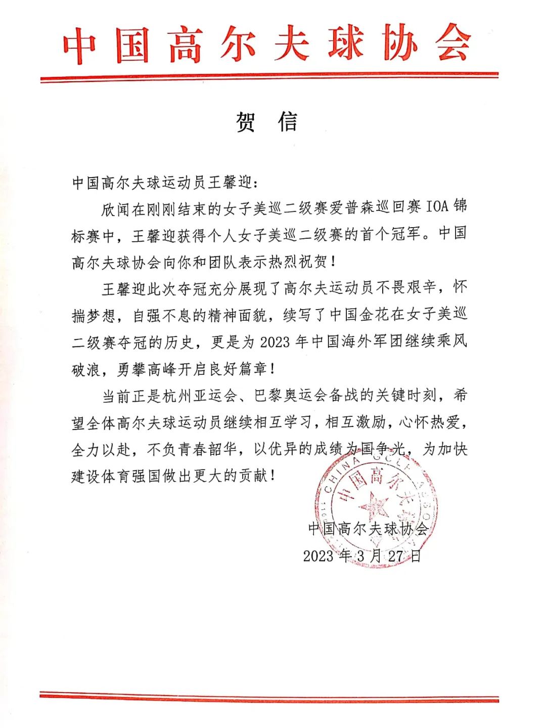 3月27日,在美国加利福尼亚州举行的女子美巡二级赛爱普生巡回赛IOA锦标赛上,中国小花王馨迎表现出色摘得冠军,捧起了自己首座女子美巡二级赛冠军,为中国高尔夫球冲刺备战杭州亚运和巴黎奥运注入了新的活力!