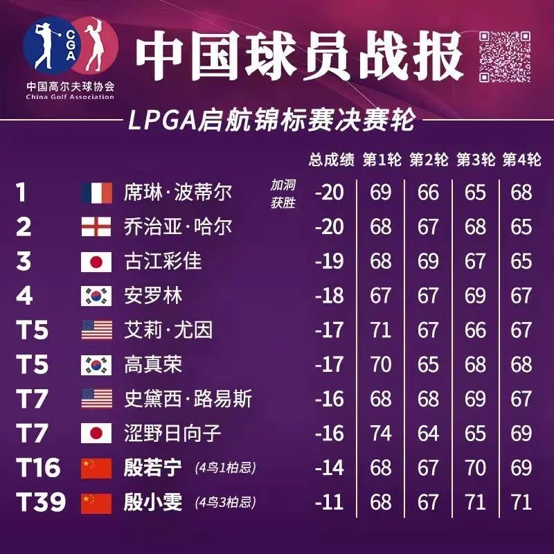 另外两位中国女将在新赛季女子美巡首场全阵容赛事续航锦标赛上表现也可圈可点,殷若宁获得并列16名,近9场比赛第5次进入前20,以会员身份参加首秀的殷小雯获得并列39位。