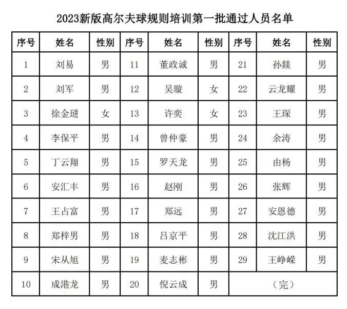 中国高尔夫球协会于今年二月开展了2023新版高尔夫球规则的培训。29位国内资深高尔夫球裁判员及规则爱好者率先完成学习并通过考核,在此对他们表示祝贺。中高协将在主办赛事中根据相应裁判员级别,优先选派完成2023新版高尔夫球规则学习并通过考核的学员。这是中国高尔夫球协会推进新规则培训的首批成果,标志着协会新规则培训体系全面启动。本次培训旨在确保裁判员对23版新规则有系统和准确的理解,为2023-2026赛季做好充分准备。