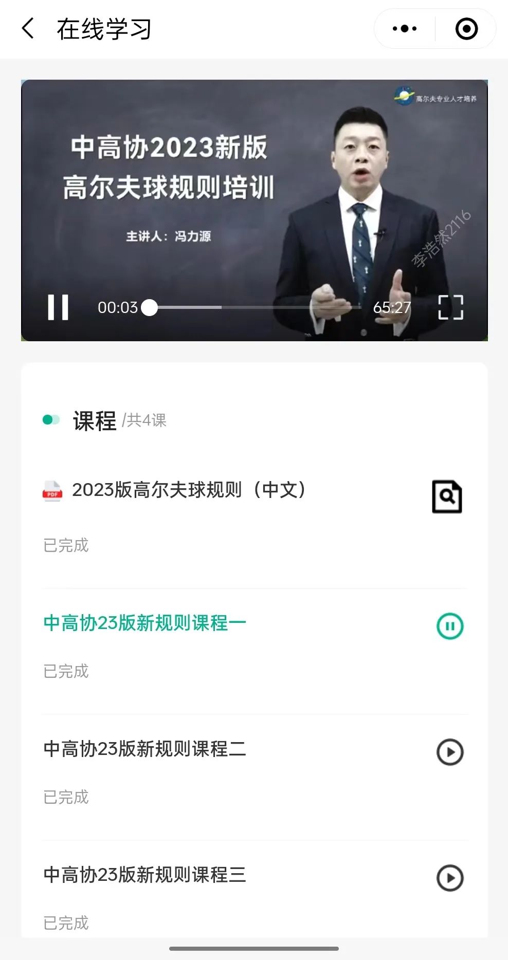培训采取线上录播课的形式,您可通过搜索微信小程序“高尔夫专业人才培养”报名学习,观看教学视频,与各资深裁判员和其他学员互动提问,深入理解规则修改内容。