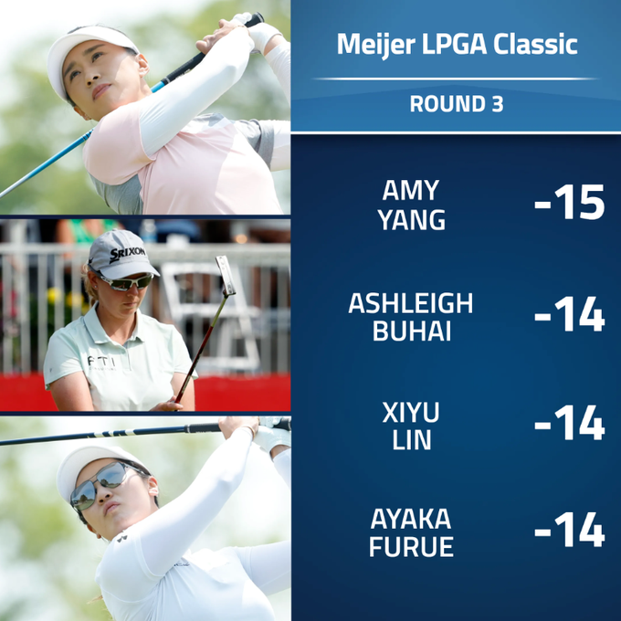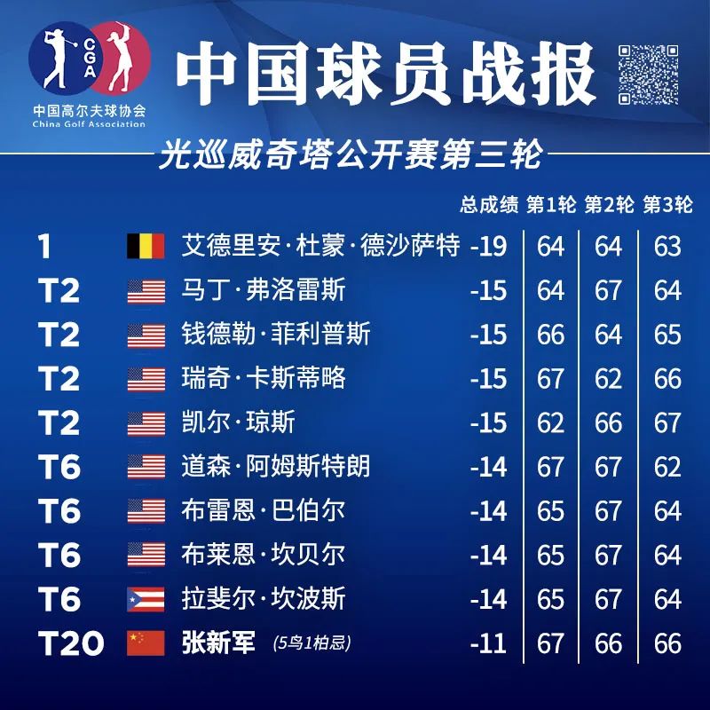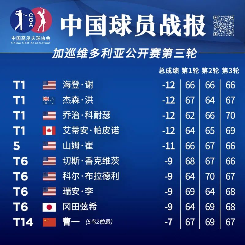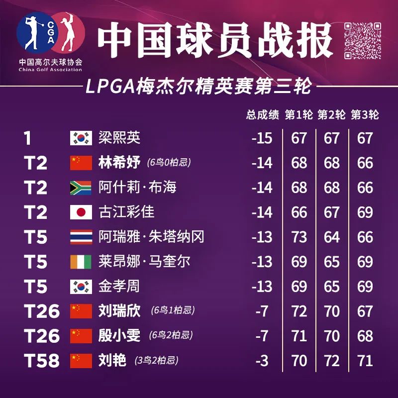 中国球员殷小雯继续交出平稳的成绩,她抓到6只小鸟,吞下2个柏忌,打出68杆,与另外一个中国球员刘瑞欣并列位于26位。刘瑞欣抓到6只小鸟,吞下1个柏忌,打出67杆,三轮成绩为209杆,低于标准杆7杆。