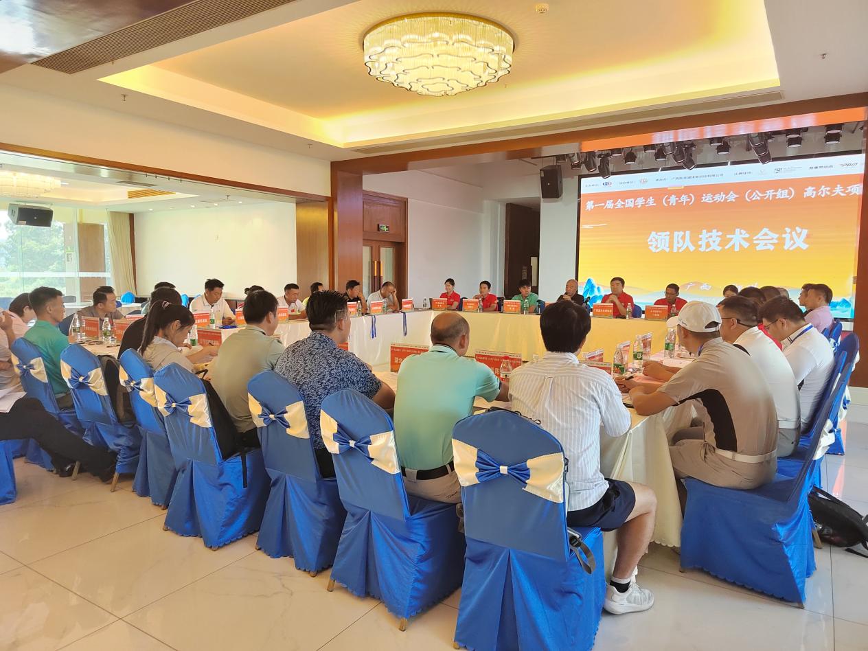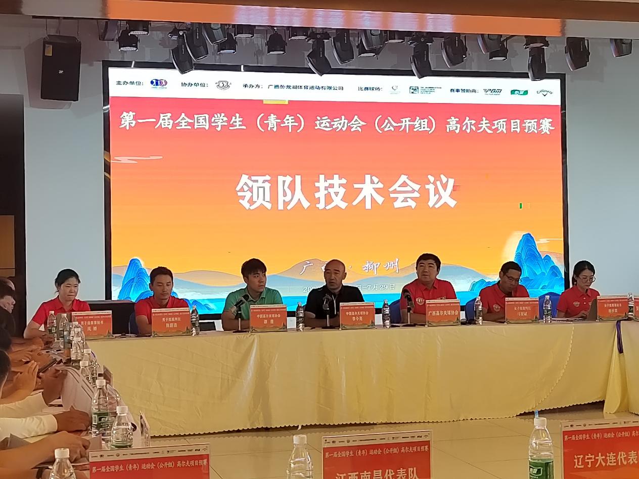 第一届全国学生(青年)运动会高尔夫项目预赛领队技术会议在卧龙湖高尔夫球会二楼会议厅召开。中国高尔夫球协会竞赛部部长李今亮,中国高尔夫球协会竞赛部项目主管谭楷,广西高尔夫球协会常务副秘书长吕粮,赛事男子组裁判长陈蔚浩、女子组裁判长马贤斌以及各省市地区代表队的领队、教练以及球员代表参与了会议。中国高尔夫球协会竞赛部部长李今亮对安全、赛风赛纪、反兴奋剂等方面提出了严格要求,各队代表在会上签署了赛风赛纪和反兴奋剂承诺书,并进行分组抽签。两位裁判长就男、女场比赛条件及当地规则、选手行为准则及比赛注意事项进行了讲解。