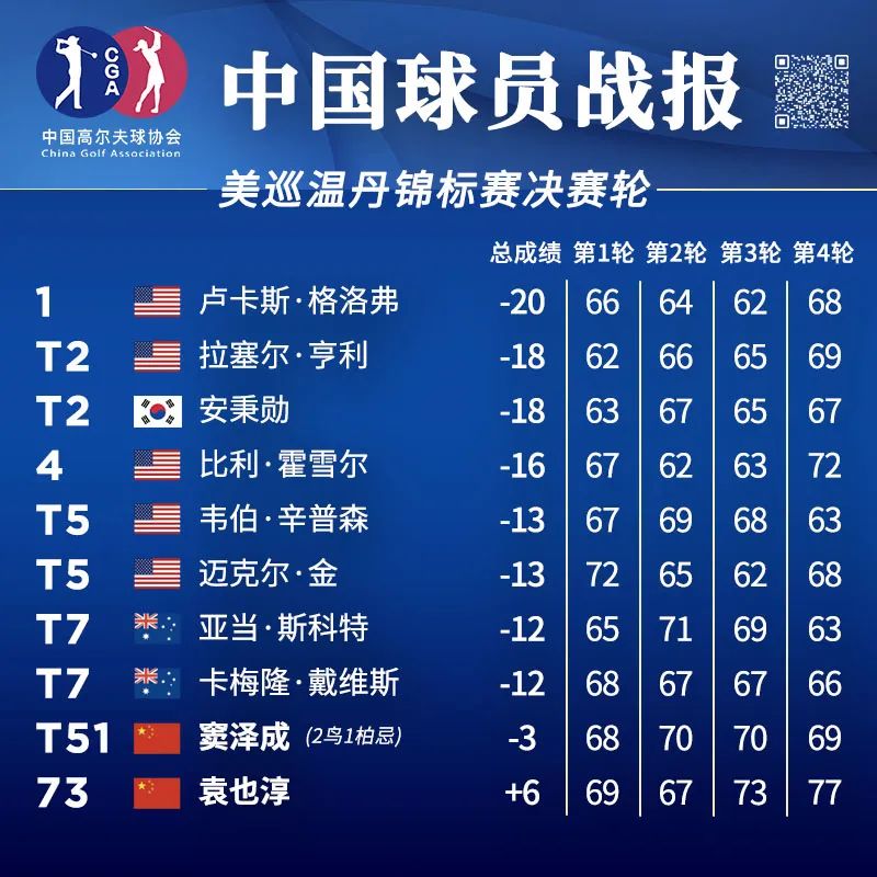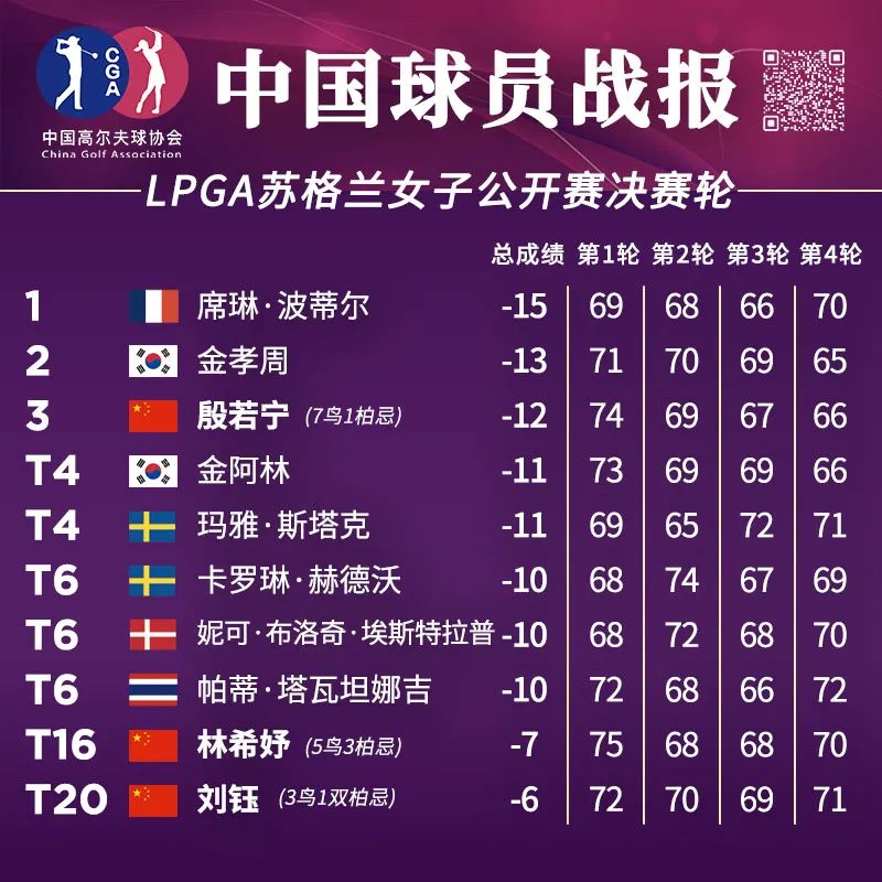 中国球员殷若宁转场之后爆发,在5个洞中抓到4只小鸟,可惜16号洞吞下柏忌,最终打出66杆,四轮276杆(74-69-67-66),低于标准杆12杆,排名第三位。这也是本赛季两度夺冠后,殷若宁第3次进入前三名。