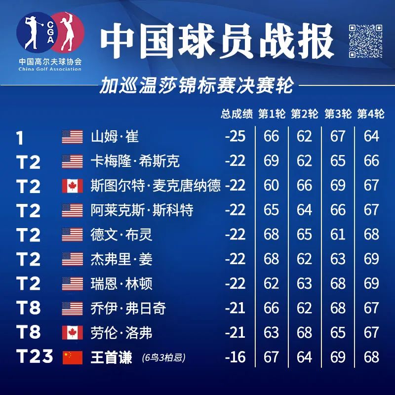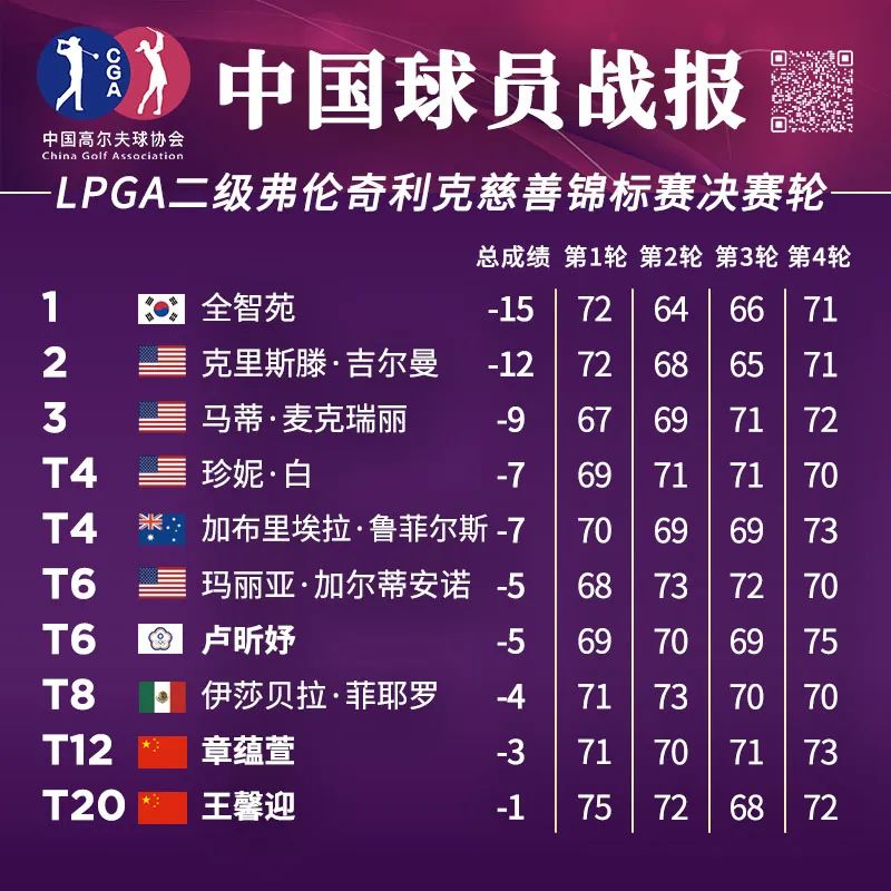林希妤打出70杆,四轮281杆(75-68-68-70),低于标准杆7杆,并列位于16位。刘钰打出71杆,四轮282杆(72-70-69-71),低于标准杆6杆,并列位于20位。