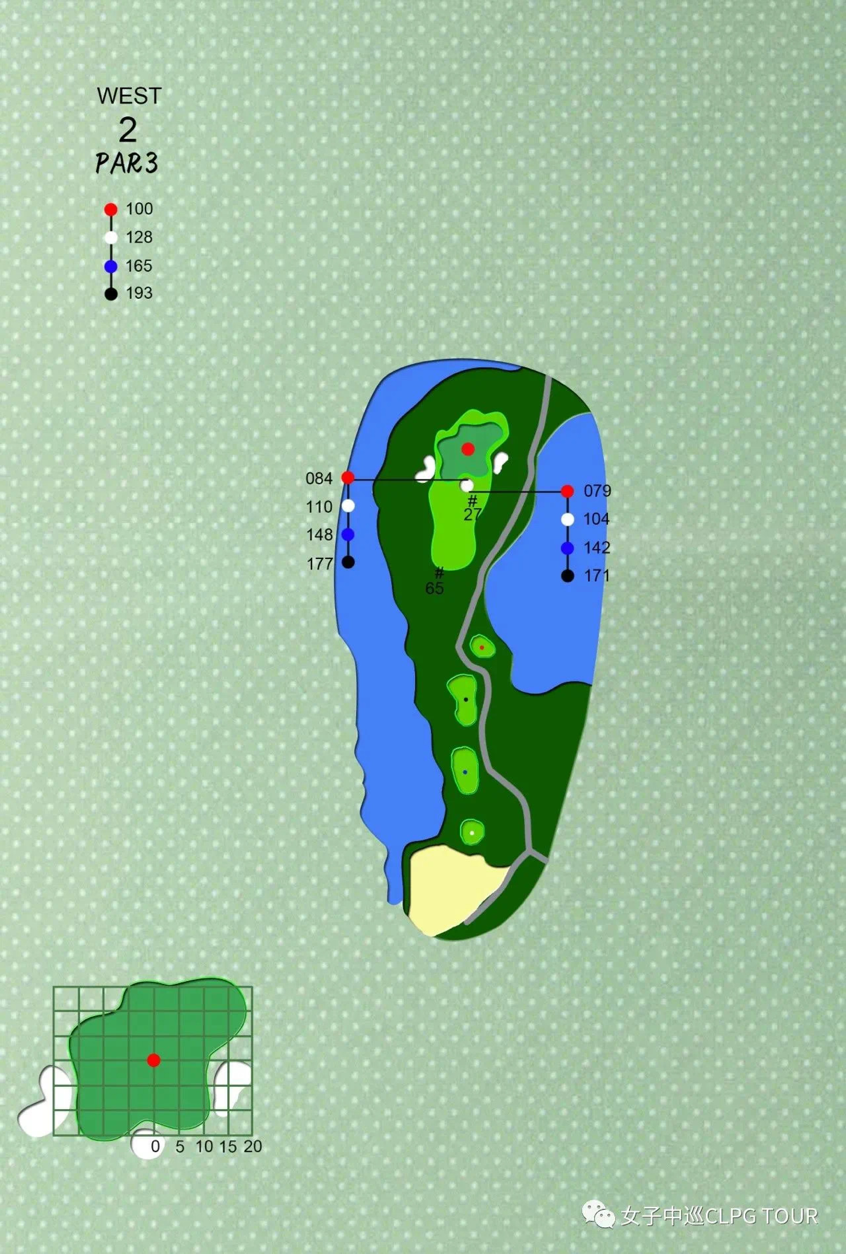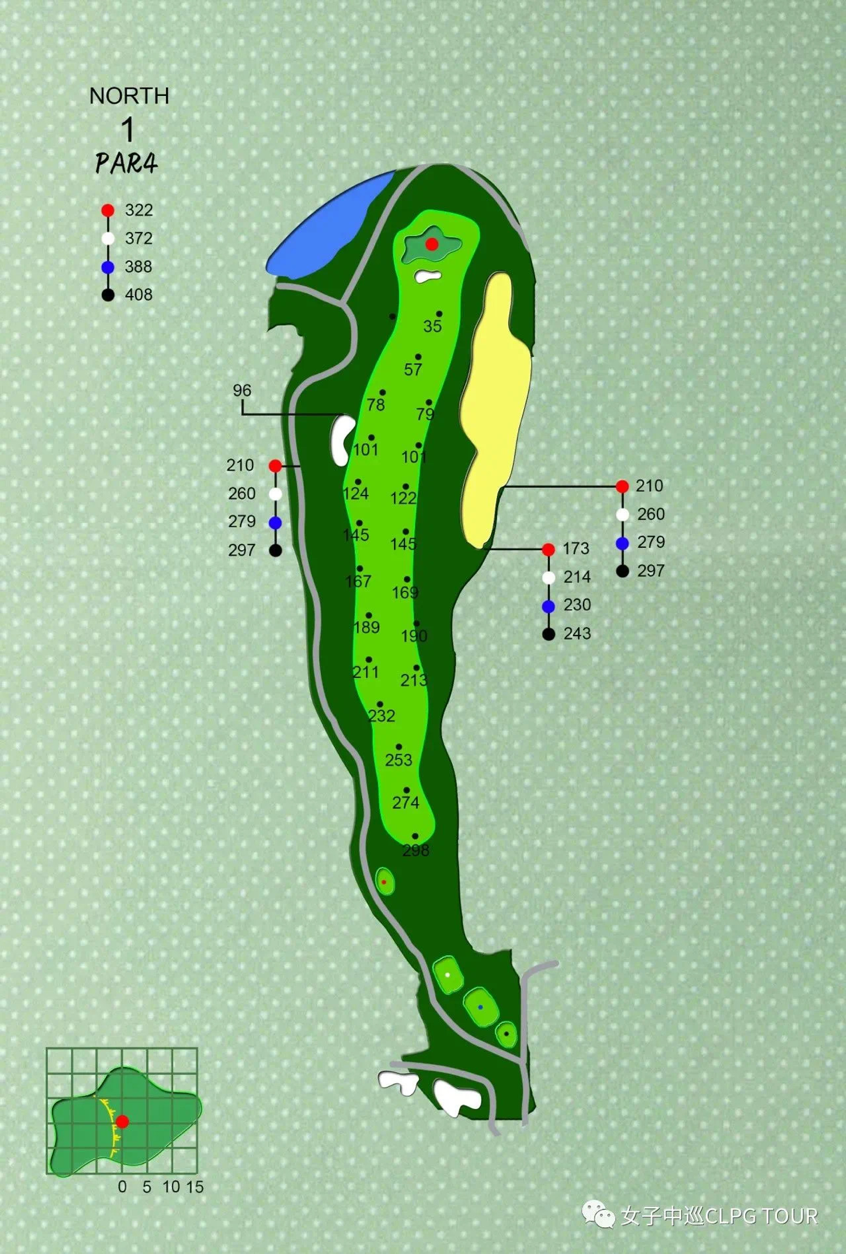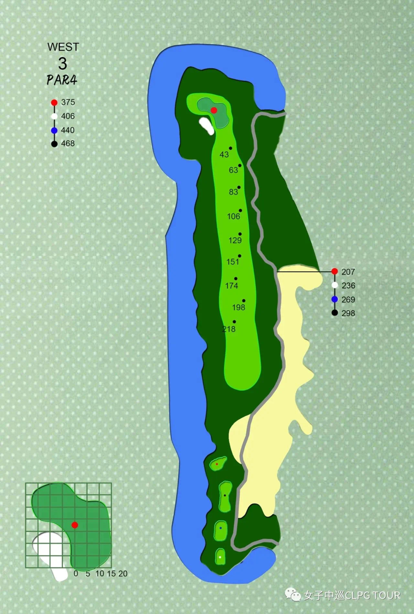 瞄准左侧的第一落球点,才可避开果岭右侧深广的沙坑,创出佳绩。