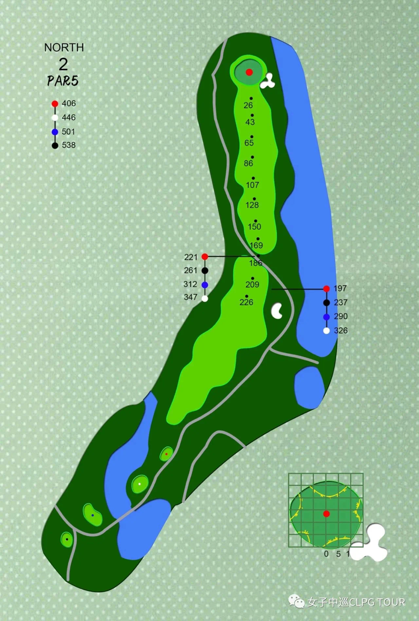 左曲球道,果岭面积是本球场之最;若球洞在后方时,谨防球滚出后方界外。