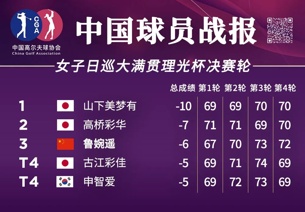 北京时间11月26日,女子日巡本赛季收官战大满贯理光杯结束。日本球员山下美梦有在宫崎县宫崎乡村俱乐部最后11个洞抓到4只小鸟,打出70杆,领先3杆取得胜。中国球员鲁婉遥抓到一只小鸟,吞下一个柏忌,打出72杆,四轮282杆(67-70-73-72),低于标准杆6杆,排名第三位,创下本赛季第二好成绩。