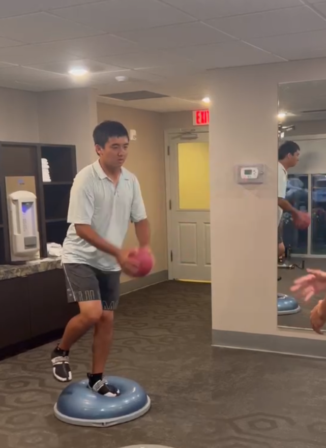 在体能训练室内,袁也淳、窦泽成、吴阿顺、李昊桐等球员挥洒汗水,从基础体能和专项体能训练上下功夫,通过强化体能训练提高挥速、增长距离、提高精准度、加强专注度和稳定性,以强化供能系统促进专项体能转化,实现降杆打赢目标。