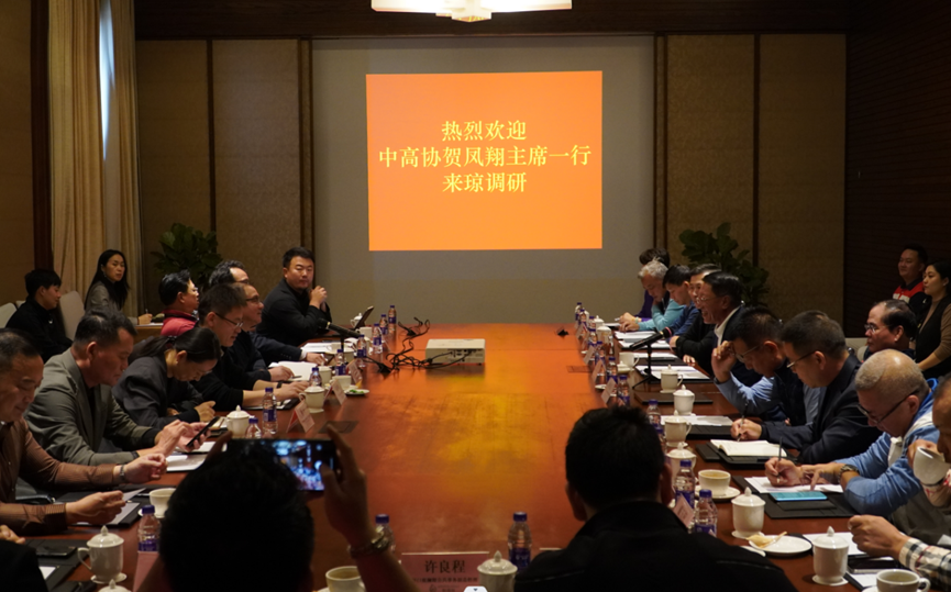 海南高协常务副主席范晓军主持座谈会。范晓军表示:中高协是全国高尔夫球事业产业的领航者。此次贺凤翔主席一行到海南调研并参与座谈会,使海南高尔夫球人备受鼓舞、倍感振奋,并改用宋代诗人李定的一首诗,描绘此情此景——“一梦岭南四十年,青山隐隐水澜澜。绿坪高阳紫荆艳,共话此处有金山”。