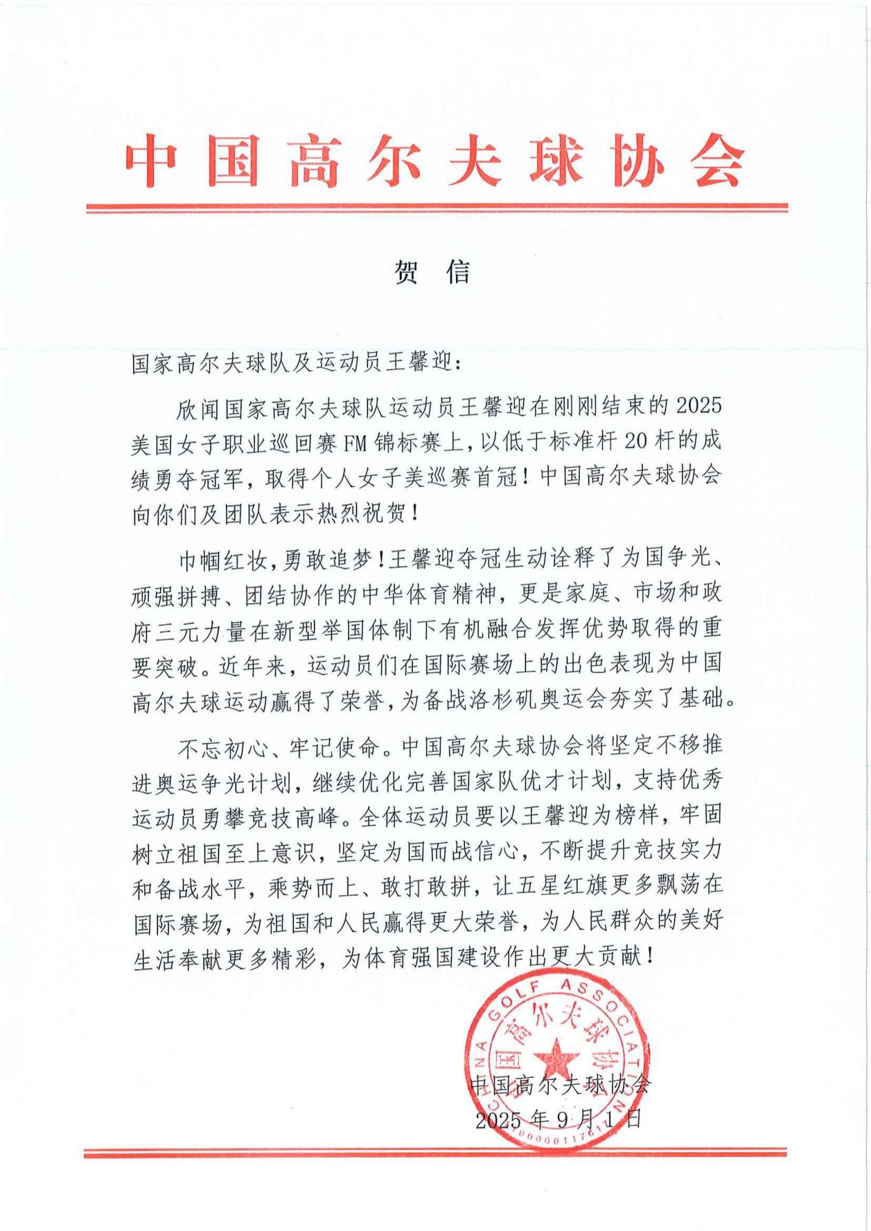 北京时间9月1日,2025FM锦标赛在马萨诸塞州诺顿市的TPC波士顿球场收官。中国国家高尔夫球队运动员、国家队优才计划成员王馨迎稳扎稳打、顽强拼搏,交出70杆,以四轮268杆,低于标准杆20杆的总成绩,夺得个人职业生涯第一座LPGA冠军,成为继冯珊珊、殷若宁之后,第三位在LPGA上捧杯的中国运动员,为中国队夺得LPGA第16冠。