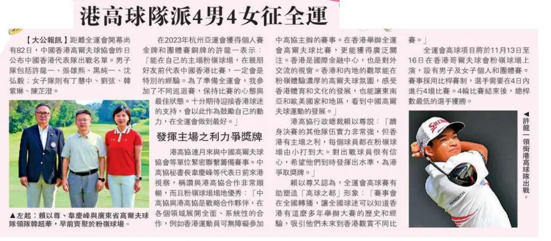 如今,这座融合了传统底蕴与现代气息的粉岭球场,正以饱满的热情,迎接着全运会的启幕,它将见证来自各支晋级代表队多轮激战,奋勇争先。让我们共同期待他们能为家乡赢得荣耀,向世界展现中国高尔夫球的力量和风采。