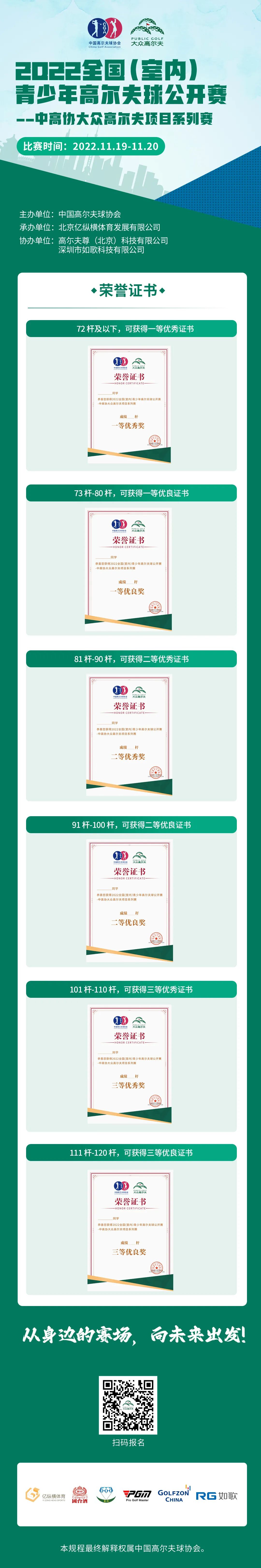 现在,2022全国(室内)青少年高尔夫球公开赛的到来,也让国家级的比赛不只是精英球员的专属。即便是初学高尔夫的孩子,也可以轻松报名,顺利参与其中,享受高尔夫竞技的乐趣!各个组别的前六名可以获得中国高尔夫球协会颁发的获得证书,冠军、亚军、季军还可以获得中国高尔夫协会颁发的奖牌以及赛事奖品!