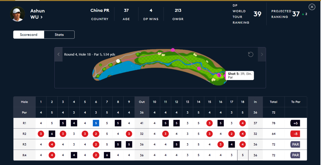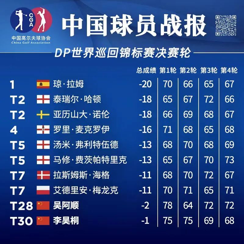 北京时间11月20日,DP世界巡回锦标赛末轮完赛,中国球员吴阿顺捉到2只小鸟,吞下2个柏忌,打出标准杆,以总杆-2(78-64-72-72)的成绩,排名并列28位。