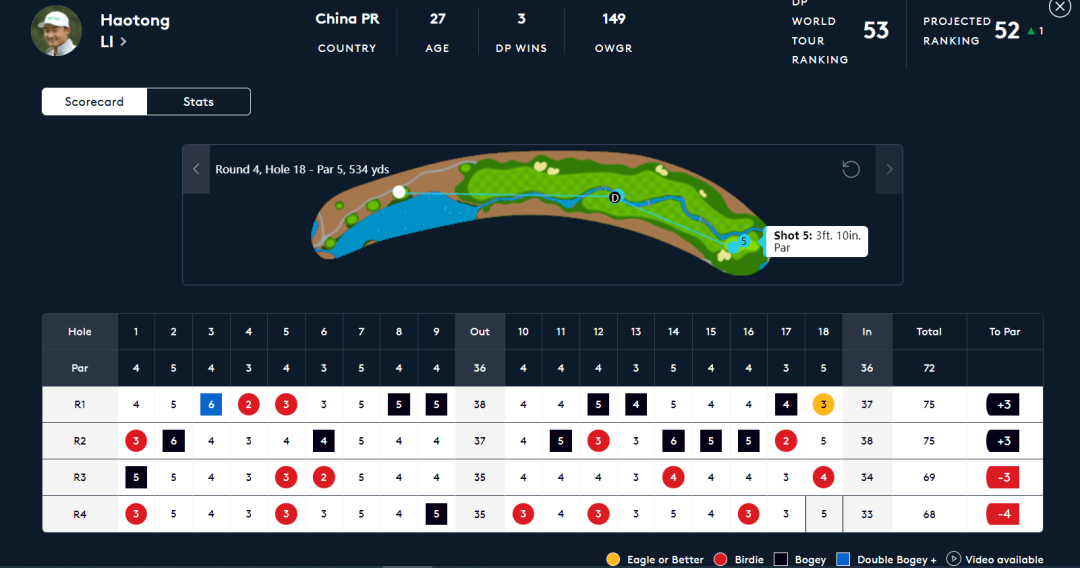 李昊桐延续了移动日的良好发挥,捉到5只小鸟,吞下1个柏忌,以单轮-4,总杆-1的成绩位列T30名。