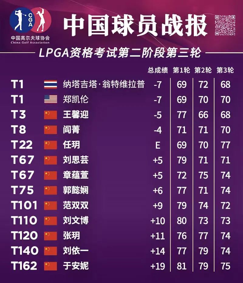 北京时间11月20日,LPGA资格考试第二关的领先人数进一步下降。在佛罗里达州威尼斯种植园高尔夫乡村俱乐部第三轮战斗结束,王馨迎从一号洞的柏忌反弹回来,抓到5只小鸟,打出68杆,与另外4位选手一道并列位于第三位,成绩为211杆(77-66-68),低于标准杆5杆。阎菁3只小鸟1个柏忌,打出70杆,上升到并列第八位,三轮212杆(71-71-70),低于标准杆4杆。任玥原本处于领先榜首位,本轮发挥欠佳,抓到一只小鸟,吞下6个柏忌,打出77杆,三轮216杆(69-70-77),平标准杆,排名下滑到并列22位。只有排名前45位选手(含并列)可以进入资格学??际宰詈笠还兀篞系列赛。