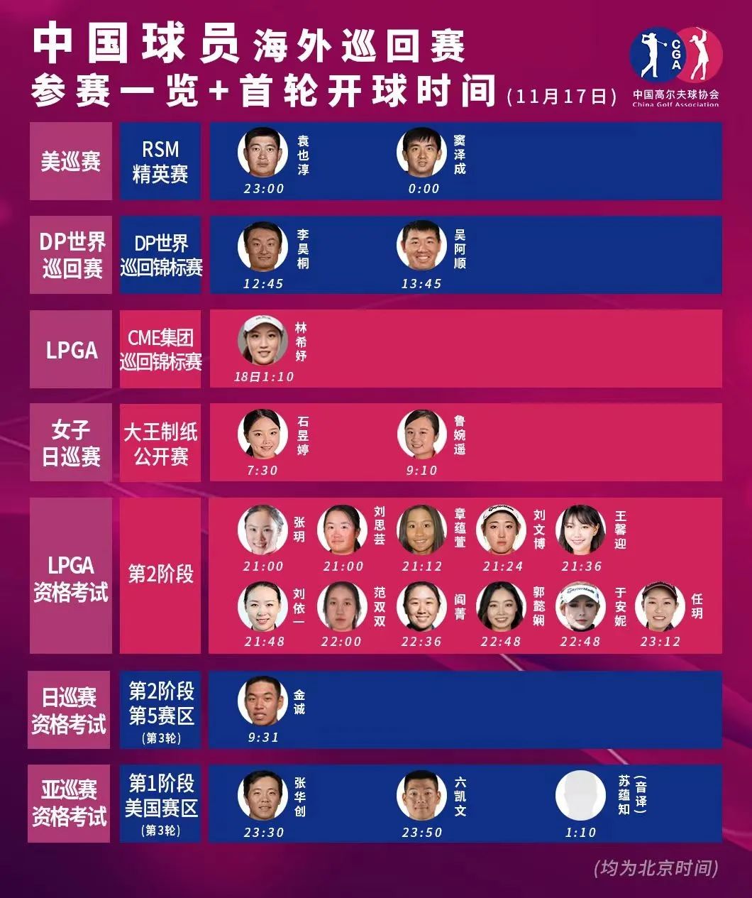 本周,多位中国球员参加美巡赛、DP世界巡回赛、LPGA、女子日巡赛,以及LPGA、日巡、亚巡资格考试,一起关注,为中国队加油!