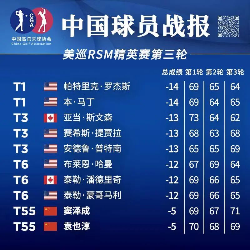 北京时间11月20日,年度最后一场正式的美巡赛——RSM精英赛移动日战罢。后两轮比赛不再分两个球场同时进行,而是在主办球场——海边球场一决高下。领先榜头部大洗牌,美国球员帕特里克·罗杰斯(本轮-6)与本·马丁(本轮-5)异军突起,排名分别上升了14位与10位,同以-14的总成绩领跑全场。