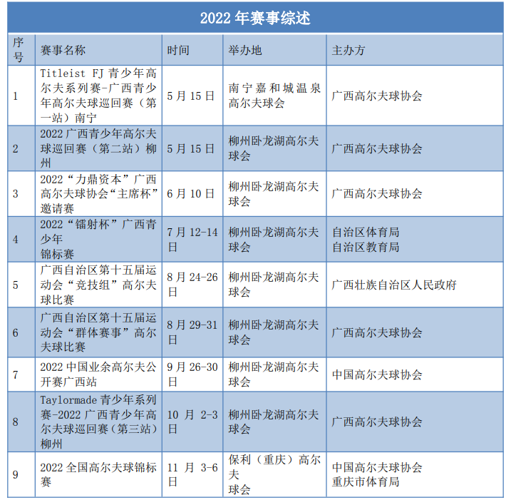 广西高协以推动广西青少年高尔夫事业为己任,对青少年高尔夫的培养做出长期的发展规划,并推出系列化的青少年赛事计划。2022 年,广西青少年巡回赛计划三场分站赛及一场总决赛,是中高协六级积分认证赛。今年的广西青少年高尔夫巡回赛吸引了知名高尔夫品牌 Tietleist 及 Taylormade 参与联合承办, 并为获奖青少年球员提供了丰厚的奖品赞助。广西青少年高尔夫巡回赛是常年系列赛事,是广大青少年球员起步发展的基础平台。通过常年参加巡回赛系列赛, 青少年球员积累参赛经验、提高竞技能力、培养高尔夫意识、获得中高协认证积分,逐步向更高级别的赛事晋级提升。