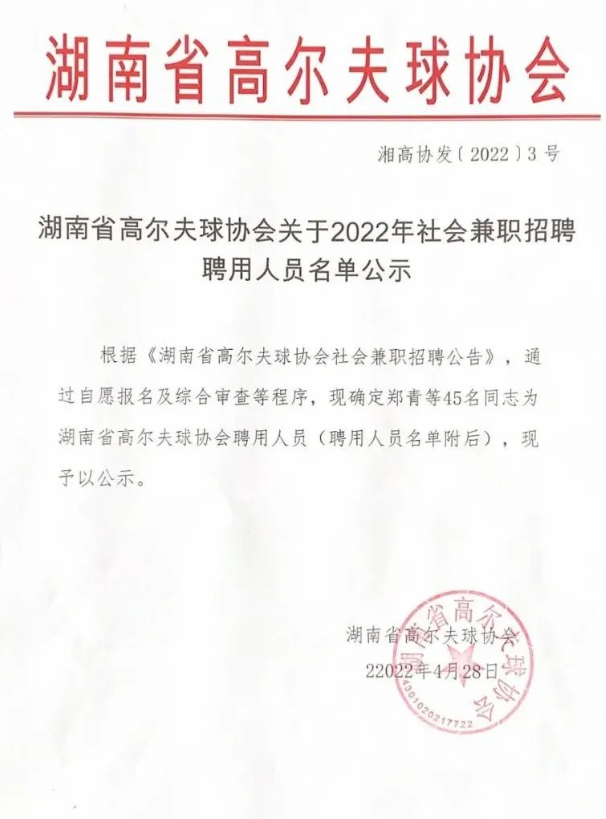 为加快湖南省体育事业改革工作,根据国家体育总局推进体育社团改革工作部署,进行市场化运作,按照社团的有关规定和改革发展需要,2月底协会秘书处面向全社会招聘6个部委优秀高尔夫球项目的有关人员,备受社会人士关注,最终通过自愿报名及综合审查等程序,确定郑青等45名同志为湖南省高尔夫球协会聘用人员,并在协会公众号上进行对外公示。协会对聘用人员进行了入职前的培训,向其介绍协会概况、明确工作要求,各部委委员由各部委主任负责管理,根据岗位职责和工作要求,指导和督促委员开展2022年工作。通过一年的试用,部分委员会成员积极参与协会多场赛事裁判执裁和赛事自愿者的工作,共同助力湖南高尔夫运动的发展。
