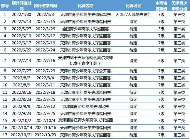 2022年天津将举办17站青少年高尔夫系列赛,其中1站三级赛、1站五级赛,1站六级赛和14站七级赛,全部赛事纳入中高协青少年积分系统,同时建立天津市独立的青少年高尔夫球积分系统,年度积分将与运动员奖励和激励政策关联。特别说明的是,17站赛事中的五级赛是由北京、天津、河北、山东、辽宁五省市高协联合承办的京津冀鲁辽青少年高尔夫球巡回赛的天津站比赛。五省市高协力争通过五年规划,把京津冀鲁辽青少年赛事打造成有影响力的品牌赛事,让孩子们在家门口就可以参加高级别的赛事,从而达到促进京津冀鲁辽青少年高尔夫事业发展的目的。此站赛事将得到市关工委和华夏未来的支持与赞助。除了这17站比赛,时隔两年的京津冀青少年高尔夫巡回赛将于2022年5月恢复举办,市关工委和相关领导对此项赛事非常重视,协会以此为契机,不断探索新的合作路径,为进一步推动高尔夫事业高质量发展做出贡献。天津高协青少年委员会将按照去年天津市青少年高尔夫球后备人才研讨会议中对2022年青少年高尔夫球竞赛、训练、普及等工作任务的部署,一一落实,包括对天津市青少年高尔夫奖励政策的制定与实施。