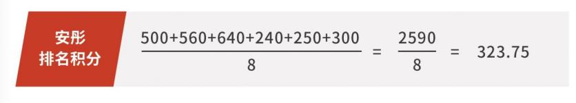 我们以安彤在2020年6月底到2021年5月底这52周内的表现为例,在这期间,她一共参加了6场比赛,名次依次为1-3-2-2-3-1,分别获得积分500-560-640-240-350-300,总积分2590,平均分323.75。